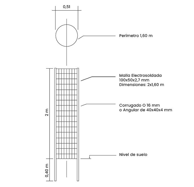La malla de reforestación, o jaula de protección, es una malla electrosoldada galvanizada con unas características concretas diseñadas para realizar la protección de los árboles nacientes de animales o de otros agentes perjudiciales para su crecimiento. Las dimensiones del paño son de 2x1,60 m y la luz de malla es de 100x50 mm y el espesor de alambre es, habitualente, de 2,7 mm, lo que le confiere ligereza, durabilidad y fácil montaje. Su montaje se realiza curvando la malla alrededor del árbol y sujetándola a elementos verticales, normalmente postes angulares (2) o corrugados de 12 mm (3), según gustos o exigencias legales, en caso de subvención. En todo caso, estos elementos se venden por separado.